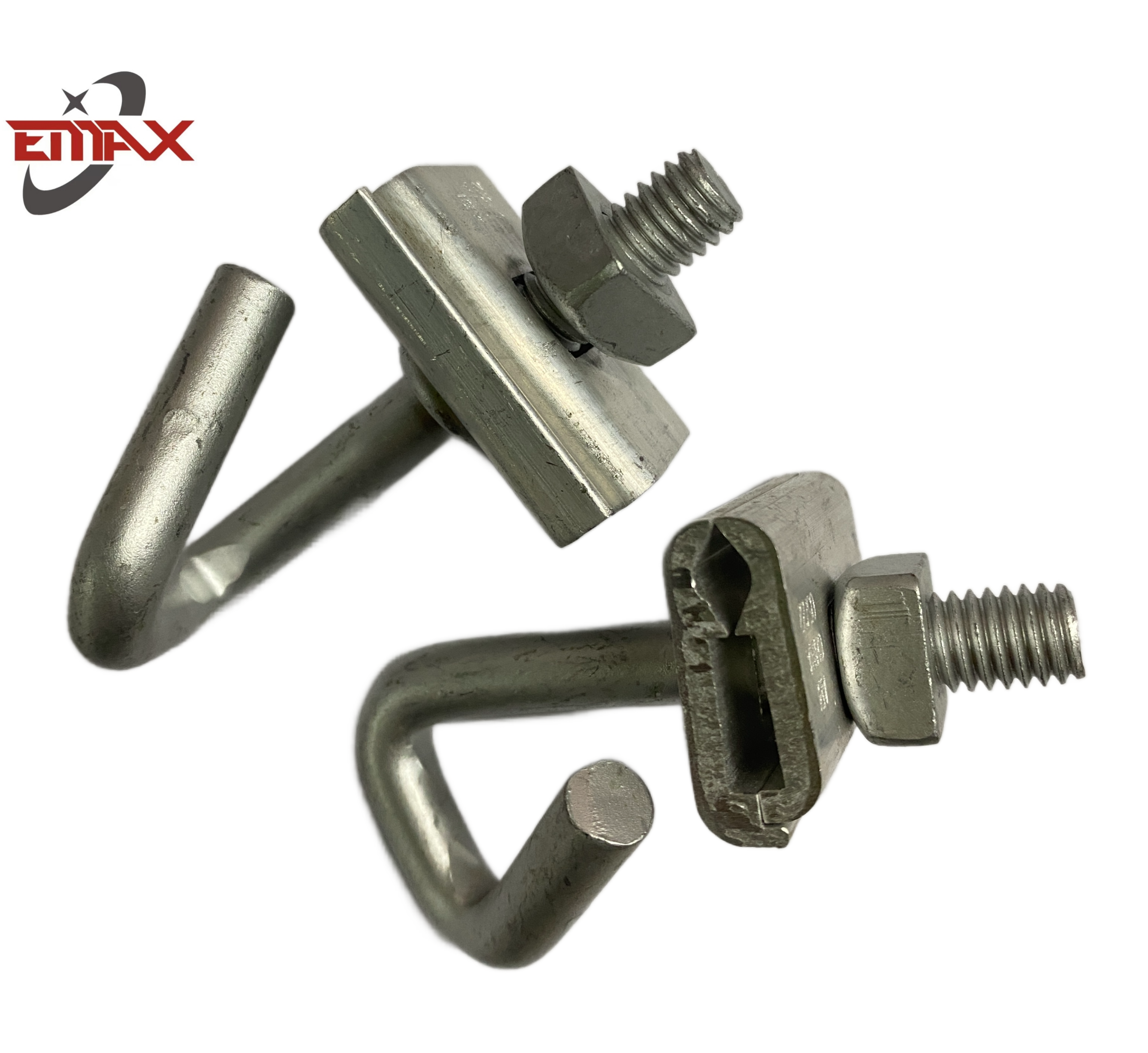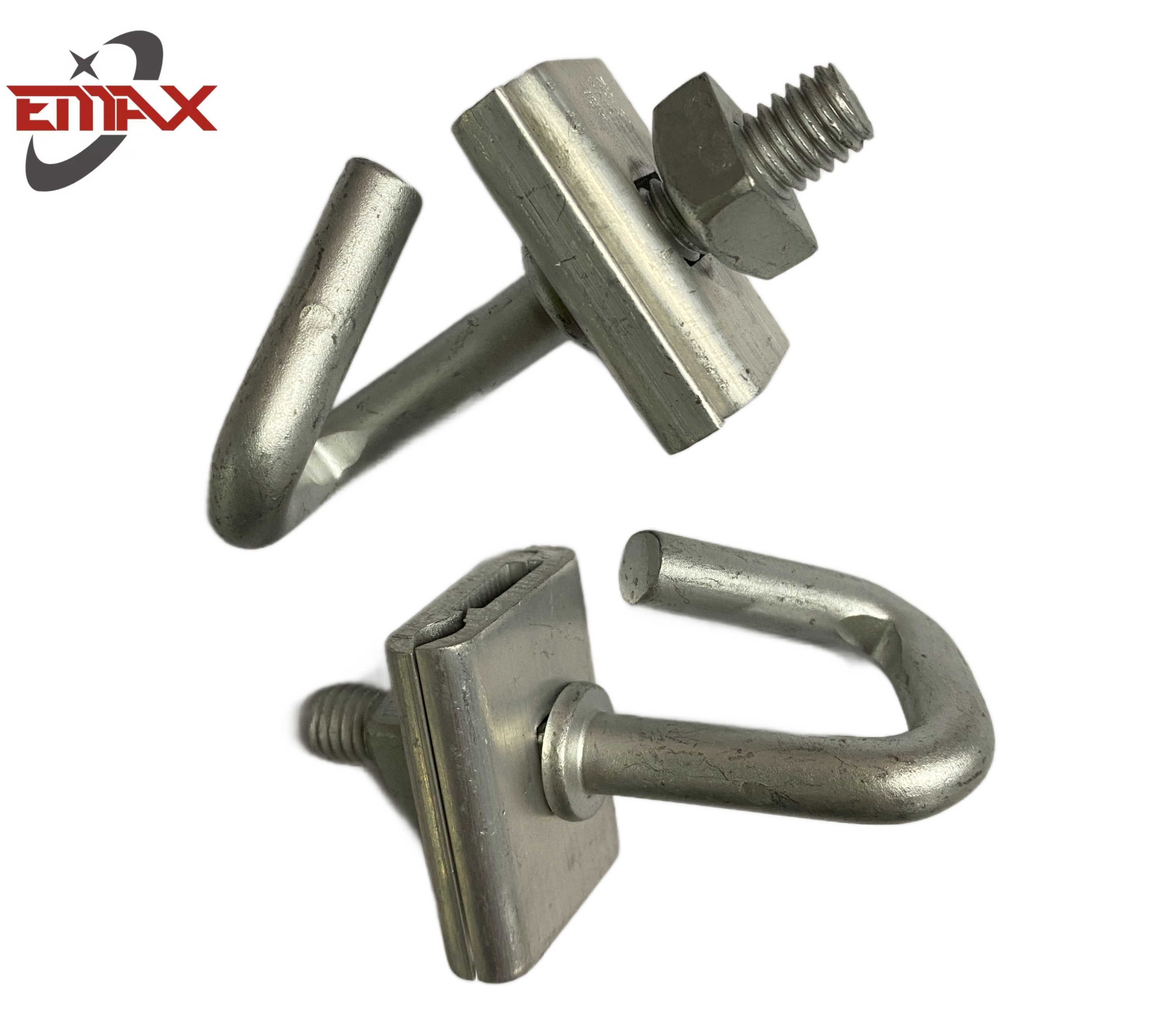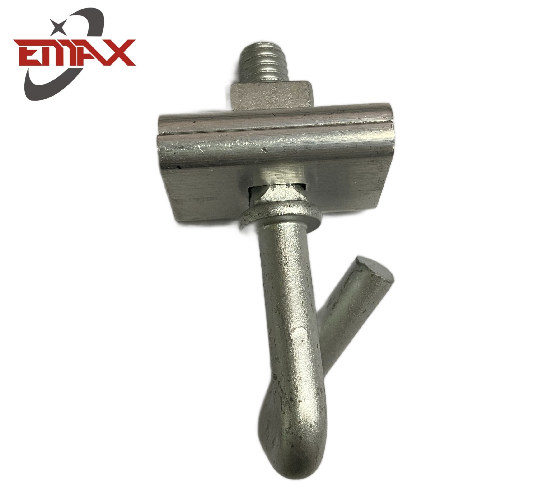 Die Klemme besteht aus einem Hakenbolzen, zwei Backen und einer Vierkantmutter.